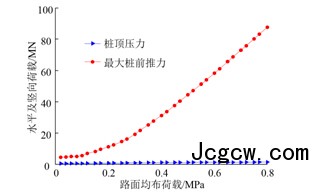 图6 桩前最大推力及桩顶压力随路面荷载变化曲线