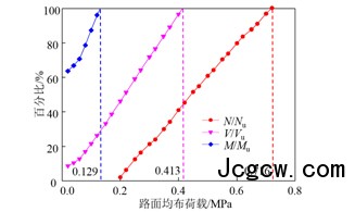 根据抗滑桩设计资料进行计算[14],得到抗滑桩的设计弯矩Mu、设计剪力Vu及设计轴力N拉和N压分别为34.87 MN•m、5.17 MN、26.04 MN和78.24 MN。在路面顶部施加不同均布荷载,通过监测抗滑桩截面最大内力与设计内力比值(N/Nu、V/Vu及M/Mu)的变化规律(如图7所示),研究抗滑桩可能出现的破坏模式。从图中可看出,抗滑桩内力与设计内力的比值随路面均布荷载的增大而增大,当比值达100%时,抗滑桩即出现不同形式的破坏。N/Nu、V/Vu及M/Mu等于100%时对应的路面极限荷载分别为0.716 MPa、0.129 MPa和0.413 MPa,可知抗滑桩的抗剪能力<抗弯能力<抗压能力,随路面荷载的增加,抗滑桩首先出现剪切破坏。