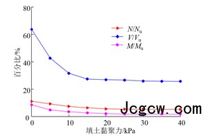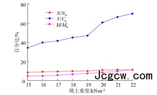 图8为填土重度对抗滑桩内力的影响。随填土重度的增加,N/Nu、V/Vu及M/Mu均不断增大,其中V/Vu变化幅度较大,最大达到70%,而N/Nu和M/Mu变化幅度不大。分析原因,是随填土重度的增大,墙背土压力不断增大,由基座传至桩前的水平推力不断增大,而挡土墙传至桩顶的压力变化很小,所以桩身剪力不断增大,但桩身弯矩及轴力变化很小。