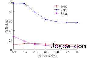 图12为挡土墙厚度对抗滑桩内力的影响。随挡土墙厚度的增大,N/Nu、V/Vu及M/Mu均不断减小,原因是随着挡土墙厚度的增加,填土方量随之减小,作用于挡土墙上的土压力不断减小,桩前推力不断减小。挡土墙厚度对V/Vu的影响较大,当挡土墙厚度为5~6.5 m时,V/Vu变化幅度较大,挡土墙厚度超过6.5 m后,V/Vu变化幅度相对较小。考虑经济性因素,可将挡土墙厚度控制在6~7 m。