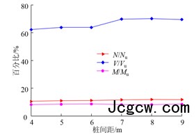 图10为桩间距对抗滑桩内力的影响。随桩间距的增大,N/Nu、V/Vu及M/Mu均增大,但变化幅度较小。原因可能是抗滑桩桩间距的增大对墙背土压力的影响很小,由基座传来的桩前推力变化不大。因此,当桩墙联合支挡结构体系稳定性安全系数满足规范[4]要求时,可适当考虑增加桩间距。