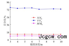 图11为锚固深度对抗滑桩内力的影响。随锚固深度的增加,N/Nu、V/Vu及M/Mu变化不明显。原因可能是桩锚固深度对抗滑桩桩前推力影响不大,且嵌岩桩存在深度效应,当嵌岩达到一定深度后,继续增加嵌岩深度,对桩的承载能力的提高已不明显,甚至无助于承载能力的提高[15]。