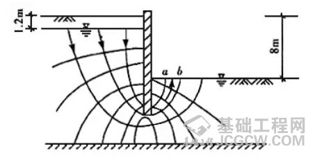 案例一:苏南某市一个项目,基坑开挖面积约为5800m2,周长约为320m,基坑周边挖深8.15m。支护采用Φ850@1200三轴搅拌桩内插 H700×300×13×24型钢支护,插一隔一,竖向设置一道预应力锚索的形式,具体方案,详见图3。本项目在专家论证的过程中,有一位专家认为,悬挂式止水帷幕没有任何意义,且他打比方讲:悬挂式止水帷幕就像女人穿裙子,不起作用。其实,仔细分析,这位专家是一位外行,犯了至少两个错误。其一,众所周知,延长渗透途径会产生水头损失,如图4所示,延长渗流途径可以降低水头,这是土力学基本常识。其二,这个比方打的也不对。女人穿裙子,她关键部位还是挡上了,不是没有任何意义。