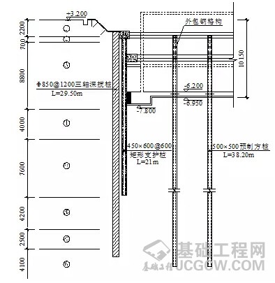 案例三:苏北某工程地下为2层车,基坑普遍侧挖深为10.15m,局部电梯坑挖深14.7m。基坑平面尺寸为160m×115m,开挖面积18500m2,整个基坑采用450×600@600矩形桩支护,竖向设置两道混凝土内支撑,具体形式见图5。