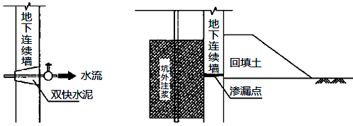 (1)围护结构缺陷造成的渗漏一般采用下面方法处理:在缺陷处插入引流管引流,然后采用双快水泥封堵缺陷处,等封堵水泥形成一定强度后再关闭导流管。如果渗漏较为严重直接封堵困难时,则应首先在坑内回填土封堵水流,然后在坑外打孔灌注聚氨酯或双液浆等封堵渗漏处,封堵后再继续向下开挖基坑。