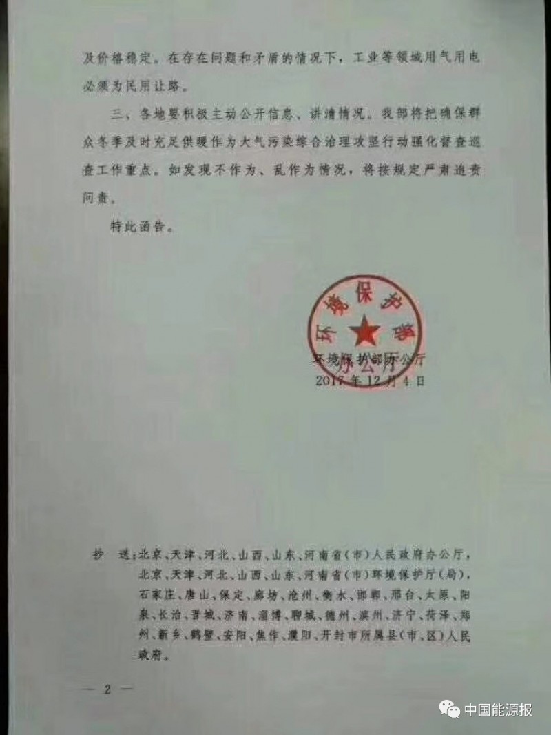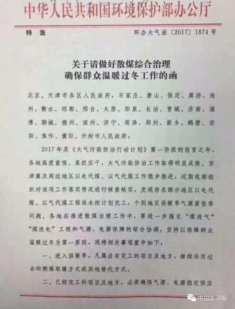 12月7日从环保部权威信源处获悉,环保部已于12月4日向京津冀及周边地区“2+26”城市下发《关于请做好散煤综合治理确保群众温暖过冬工作的函》特急文件,提出坚持以保障群众温暖过冬为第一原则,“进入供暖季,凡属没有完工的项目或地方,继续沿用过去的燃煤取暖方式或其他替代方式”。