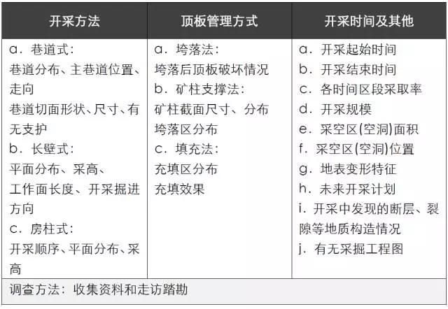矿层的分布范围,开采和停采时间,开采深度、厚度和开采方法,主巷道的位置、大小和塌落、支撑、回填、充水情况,以及开采计划和规划等。