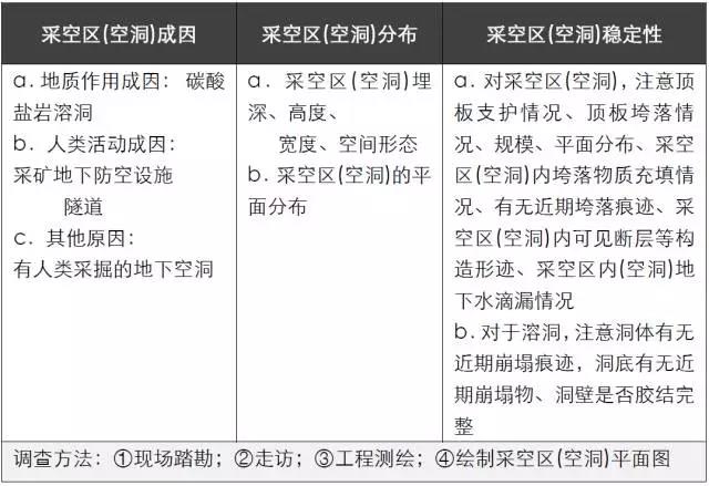 查明采空区引起的垮落带、裂隙带和弯曲带的埋深、具体高度和发育状况;查明地下水的埋深及其对混凝土的侵蚀性;