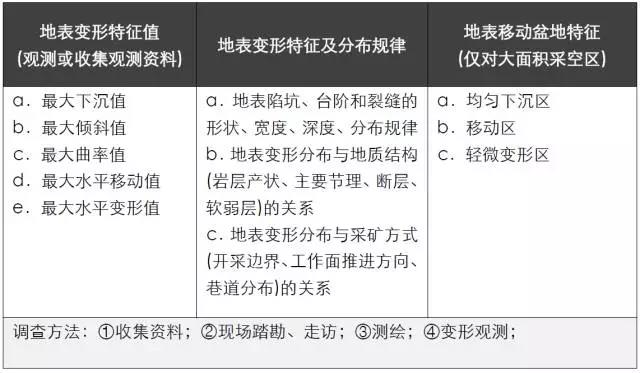 地表陷坑、裂缝的位置、外形大小、深度、延伸方向及其与采空区和地质构造的关系。