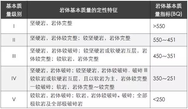 岩体基本质量由岩石坚硬程度和岩体完整程度所决定。应把岩体基本质量的定性特征和岩体基本质量指标(BQ)两者相结合。参照《工程岩体分级标准》划分。