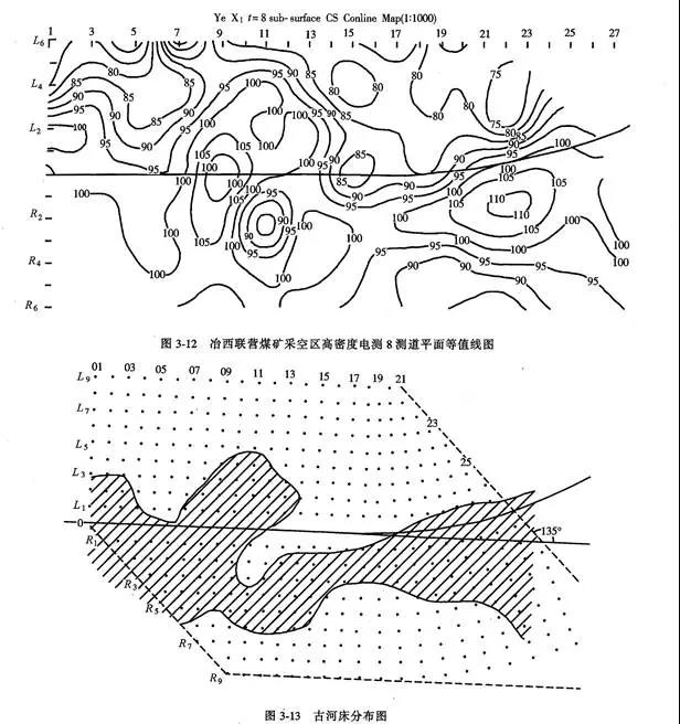 电法勘探常采用高密度电法和电测深法。高密度电法最适宜的采空区探测深度范围是100m以内,最大深度不超过150m,采空区埋深与其直径的比h/D≤40。影响探测深度的因素:测距的长短;目标地质体的直径与深度的比;目标体与围岩电性差异;地电断层如有高(低)阻屏蔽层;干扰水平大小。