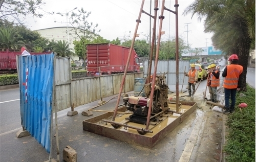 15日10时,记者来到沙井大道南乡村路口附近看到,在沙井大道南乡路口至五一路口段的车道上有围挡施工,但围挡得比较简单。施工方在打钻勘察岩土,由于下着细雨,有黄泥水从围挡的工地内流到路面。此时,打钻勘察作业已经被叫停,工地相关负责人正在接受城管执法人员的问话。