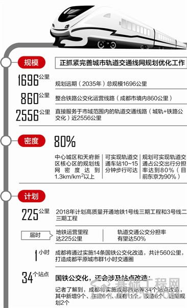 记者了解到,成都市正抓紧完善城市轨道交通线网规划优化工作。其中,规划远期(2035年)总规模1696公里;整合铁路公交化运营线路(成都市境内860公里),直接服务于市域范围内的轨道交通线路(城轨+铁路公交化)达到近2556公里。中心城区和天府新区核心区的规划线网密度达到1.3km/km2以上,与东京目前线网密度相当,可实现轨道交通车站10~15分钟步行可达。规划可实现轨道交通占公交出行分担率达到80%,而目前东京为90%。线网密度和轨道交通分担率均达到世界先进水平,规划实现后可进一步优化居民交通出行结构,提升居民出行品质。