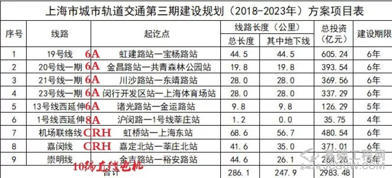 19号线工程自虹建路站至宝杨路站,线路长 44.5 公里,设站 32 座,投资 605.24 亿元,项目建设工期为 6 年。