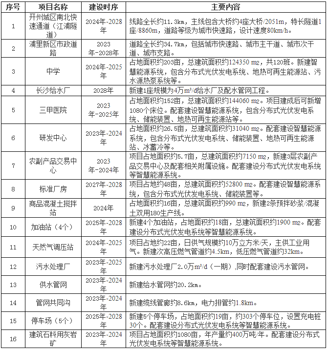 (1)市政基础设施项目:包括开州城区南北快速通道(江浦隧道)、浦里新区市政道路、停车场、天然气调压站、污水处理厂、给水厂、供水管网、管网共同沟。