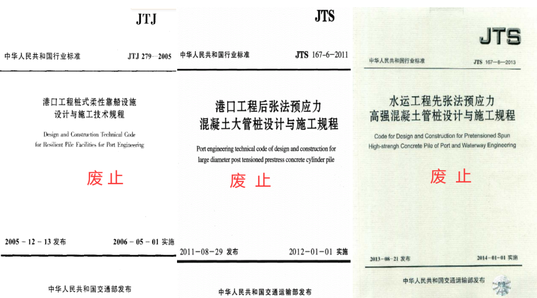 《港口工程桩式柔性靠船设施设计与施工技术规程》(JTJ 279—2005)、《港口工程后张法预应力混凝土大管桩设计与施工规程》(JTS 167—6—2011)、《水运工程先张法预应力高强混凝土管桩设计与施工规程》(JTS 167—8—2013)同时废止。《码头结构设计规范》(JTS 167—2018)中的桩基设计部分与本规范不一致处,按本规范执行。