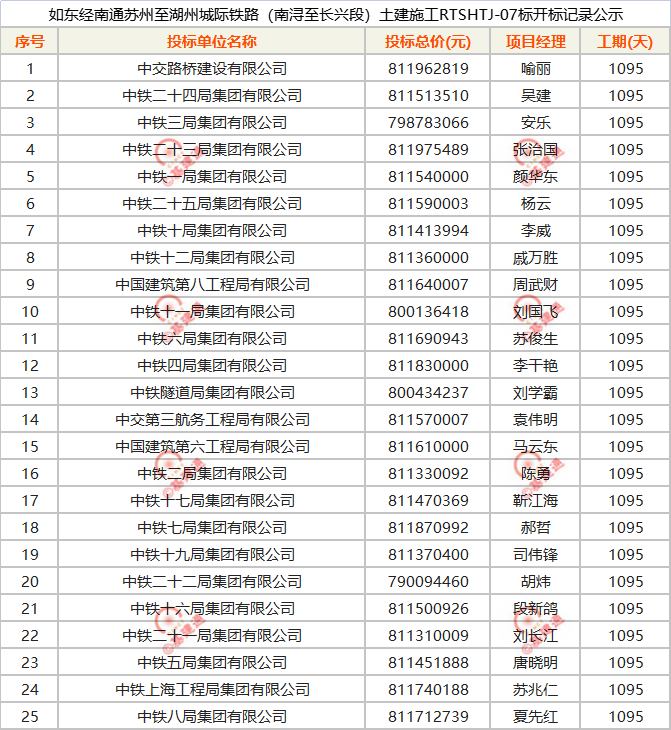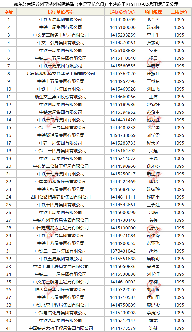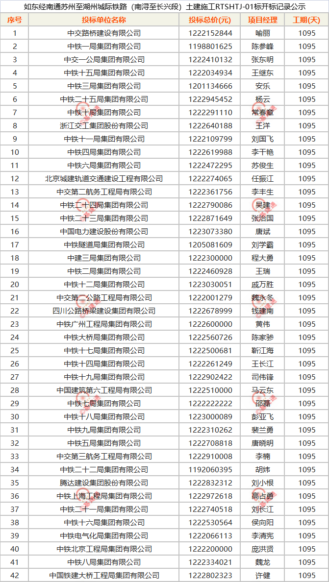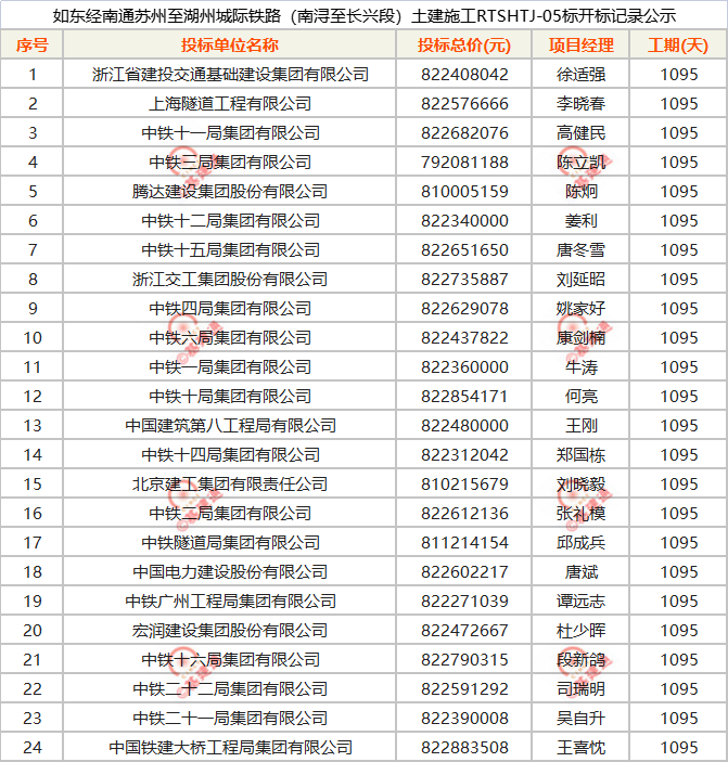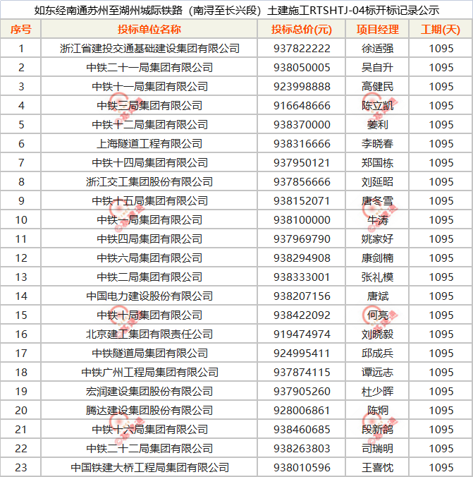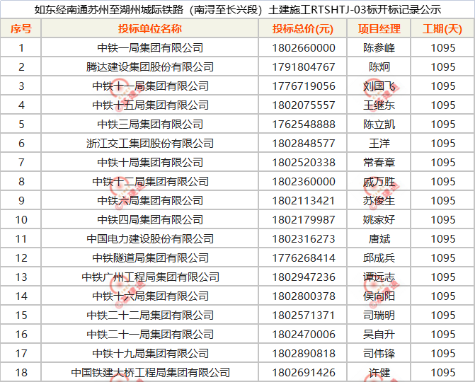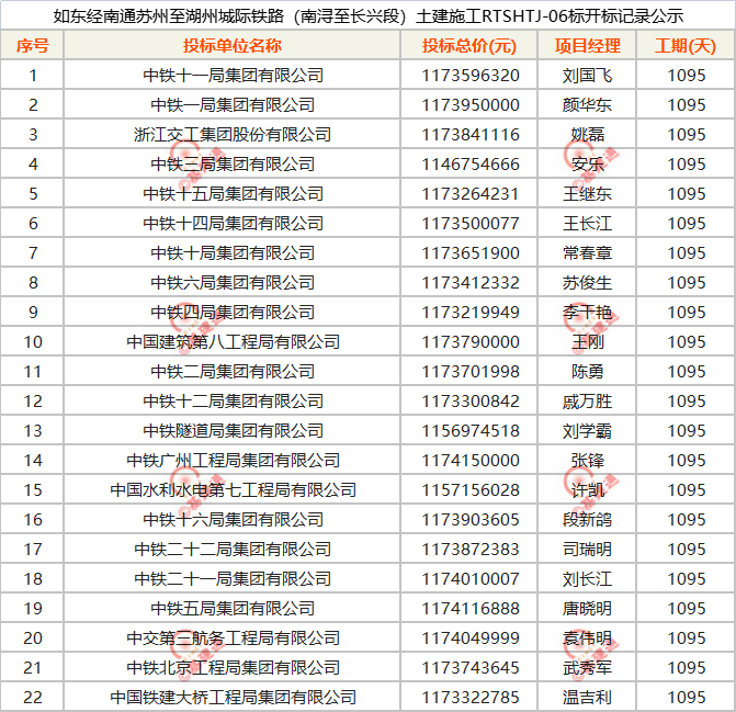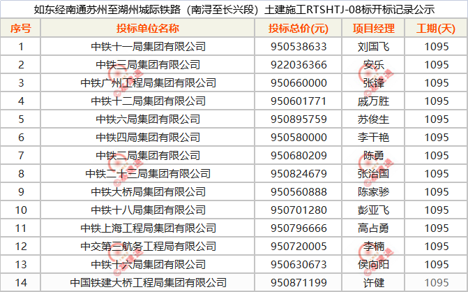 如东经南通苏州至湖州城际铁路(南浔至长兴段)土建施工RTSHTJ-01标~RTSHTJ-08标开标结果公示