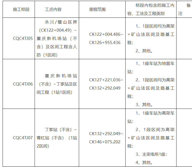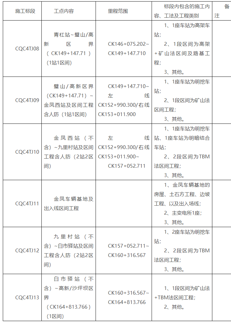 包一:本招标项目里程桩号为:CK146+075.202~CK164+813.766线路长度为18.7km(包括青杠站~高新/沙坪坝区界的区间工程及车站工程等,对应CQC4TJ08、CQC4TJ09、CQC4TJ10、CQC4TJ11、CQC4TJ12、CQC4TJ13,6个施工标段)。