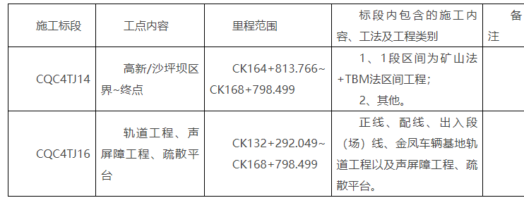 包五:本招标项目里程桩号为:CK099+995.000~CK111+504.000(不含CK103+748.320~CK105+494.320)线路长度为9.8km(包括陈食停车场及出入线,起点~双堰塘特大桥起点的区间工程及车站工程等,对应CQC4TJ01、CQC4TJ03,2个施工标段)。本招标标包合同估算金额:14.0亿元。