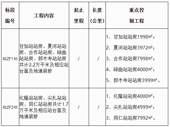 本次施工招标分为2个标段。标段编号XCZF1标段(甘肃省境内站房工程)、XCZF2标段(青海省境内站房工程)。