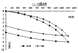 其中2组管桩桩顶采用C30微膨胀混凝土填芯,填芯高度5m,内插12Φ22螺纹钢筋,其U-S曲线见图5。
