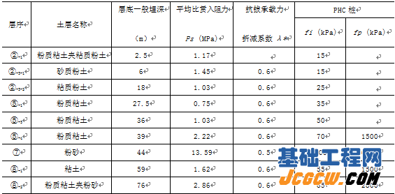 ××广场工程位于上海市闸北区海宁路南侧、河南北路以西、塘沽路以北、拟建山西北路以东。总建筑面积为79930m2,地上建筑面积58836m2,地下建筑面积21094m2。四栋主楼建筑物为剪力墙、框筒或框架结构,均设2层地下室。基础采用桩基础,主楼桩型采用PHC600及PHC500管桩。根据岩土工程勘察报告,预制桩(PHC管桩)的设计参数如表1所示。上海地区的地下水位一般在地面下0.5m左右,由于除主楼区域外均为2层纯地下室,故需设置抗拔桩以抵抗水浮力。根据地下室的抗浮计算以及柱下布桩的要求,需要选用单桩抗拔承载力较高的桩型作为本工程的抗拔桩。