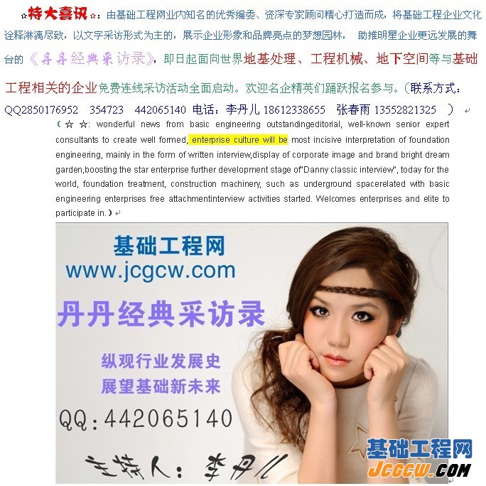 ☆特大喜讯☆:由基础工程网业内知名的优秀编委、资深专家顾问精心打造而成,将基础工程企业文化诠释淋漓尽致,以文字采访形式为主的,展示企业形象和品牌亮点的梦想园林, 助推明星企业更远发展的舞台的《丹丹经典采访录》,即日起面向世界地基处理、工程机械、地下空间等与基础工程相关的企业免费连线采访活动全面启动。欢迎名企精英们踊跃报名参与。