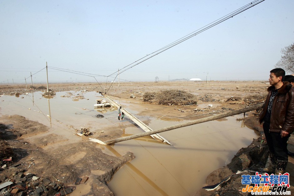 2月15日早7时,山西省洪洞县曲亭水库灌溉输水洞洞顶垮塌,导致下游坝体出现管涌,当地政府迅速组织疏散村民。经过27小时全力抢险,延缓了大坝坍塌时间,但终因涵管老化严重(1959年建设)而漏淘形成坝体塌陷,致大坝在涵管处坍塌过水。图为2月17日,被大水冲毁的农田。