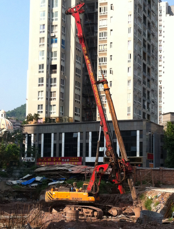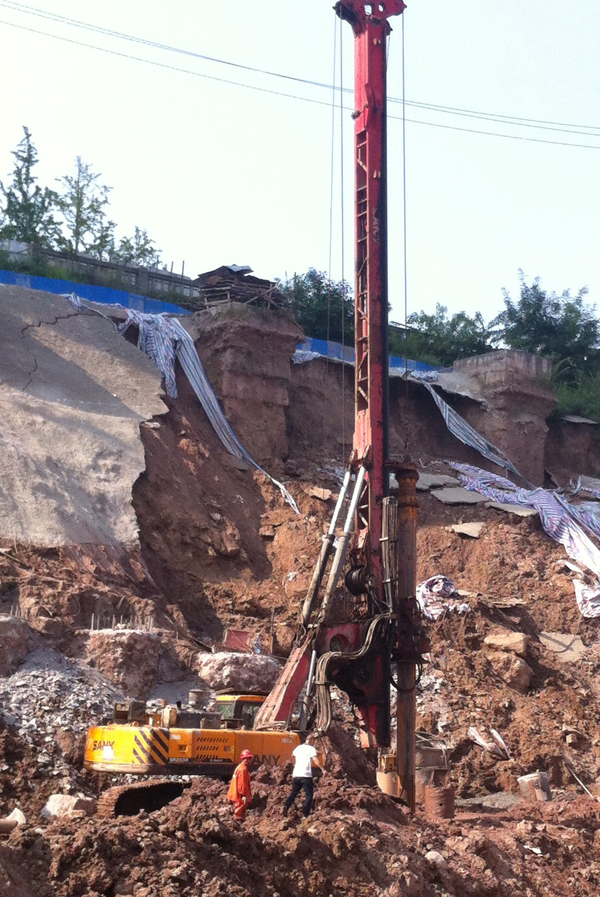 近日,记者带着浓烈的兴趣专程前往钻得地基位于万州北山正在施工的3个项目现场——万州区幸福移民小区统建房改造工程(A-2、A-4)、国润·水韵天成(1#、2#、3#)、清江·金水御景进行实地考察。进入移民小区统建房改造工程施工现场后,一台三一重工315R型旋挖钻机豁然展现在记者眼前。现场负责人告诉记者,该台设备是三一重工研发生产后成功售出的第一台315R型旋挖钻机,目前在该项目中最大成孔直径为1.2米,桩深最深达50米,是现目前万州最深的桩基项目。三项目总涉及桩基总数达400根,其中国润·水韵天成体量最大,支护桩与房屋桩共300根桩,且最大桩直径达2.5米,口径之大在万州当地也实属难见,加上该项目地下水比较丰富,杂石颇多,导致施工过程中遇到较多问题,垮孔现象时常发生,因而会针对桩基的不同情况选用干护筒、泥浆护壁等工艺进行施工。然而上述项目难度及复杂程度均不及桩基根数仅20根的清江·金水御景项目,因其地质结构为回填土层,加之泥岩混杂其中,几乎每钻一个桩孔都需要混凝土回填,普遍2到3次便能成孔,最多6次才能成孔,否则便是一孔不成。