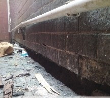 上图:美丽花城小区西侧居民楼外墙与地面连接处开裂。