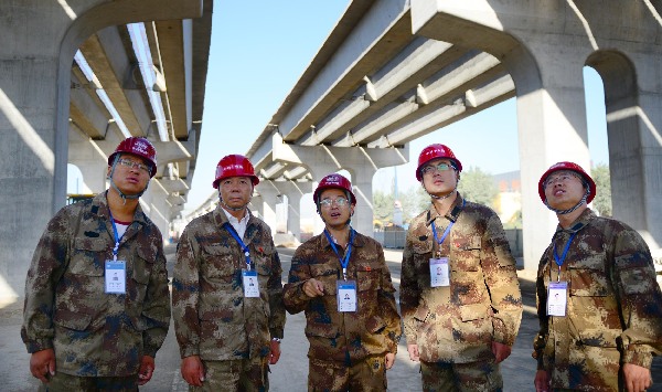 中国铁建十六局呼和浩特二环西北线快速路工程二分部经理齐永利(中)、党工委书记孙成聚(左二)、总工程师于海瑸(右二)和技术人员在施工现场