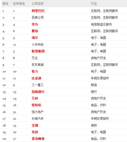 其中,阿里重新登顶全明星榜,百度名列第二,华为则进入了三强,腾讯、海尔、小米、联想、万达、京东、格力分别占据其它几个10强席位。