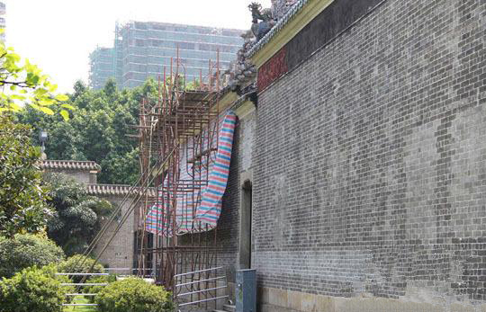 核心提示: 陈家祠管理方自己用木桩对墙体进行支撑。