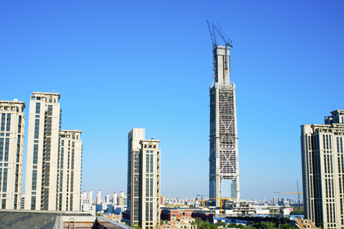 中建三局天津117大厦项目执行总经理侯玉杰介绍,目前,主塔楼正以最快两天一个结构层的速度攀升,预计2015年主体结构封顶,届时将以597米的高度成为中国结构第一高楼。