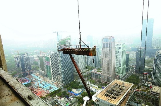 市住建局的相关负责人介绍,该项目采用的4台重型塔吊均为国内建筑行业最大型号的起重设备,均采用附着于主体结构外墙,施工过程中塔吊将依靠支承架逐步向上顶升,远远望去,犹如4个超级巨人附着于陡峭的墙壁缓慢地向上攀爬。这一艰难的“爬升”过程给施工带来了巨大的挑战,最大难点就在于支撑塔吊爬升的支承系统的设计。施工方最终自主研发设计了适用于本项目的支承系统,成功实现了“超级巨人”的爬升。