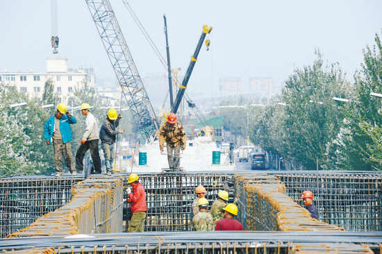 核心提示: 10月8日,记者登上十几米高的高架桥看到,在最暖流年与君忆,精品工程与君老醒目的大字下,工人们正在如火如荼地紧张绑扎钢筋