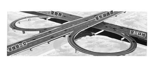 根据规划,虹景立交包括两座高架,即位于珞喻东路上方的东西高架和位于光谷大道、喻家湖路上方的南北高架,以及两个匝道。