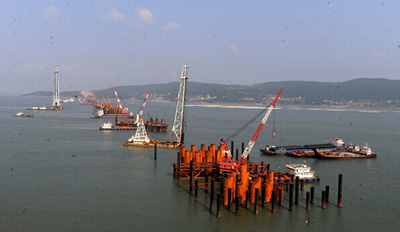 核心提示: 中国铁建大桥工程局集团有限公司承建我国首座铁路、公路合用的跨海特大桥,福(州)平(潭)铁路北东口水道特大桥2013年10月
