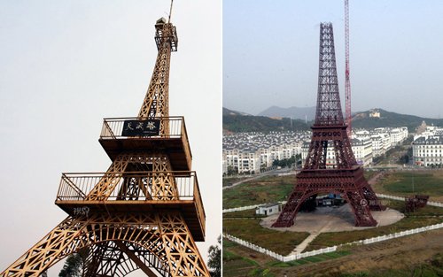 位于杭州的天都城住宅小区里,竖立起一座仿法国埃菲尔铁塔的建筑。它按1∶3比例缩放设计修建。全塔由基础和上部钢构组成,塔基为大体积混凝土现浇承台和钻孔桩基组成。塔身为全钢构连接件组成,整体钢结构件总重达1000余吨。全塔共分8个区段,每区段设有观光休息平台,配有斜向直升电梯供游客上下,塔身总高度108米。