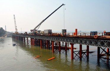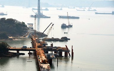 1531米的栈桥旁边,26台钻机正忙着进行桩基础施工作业