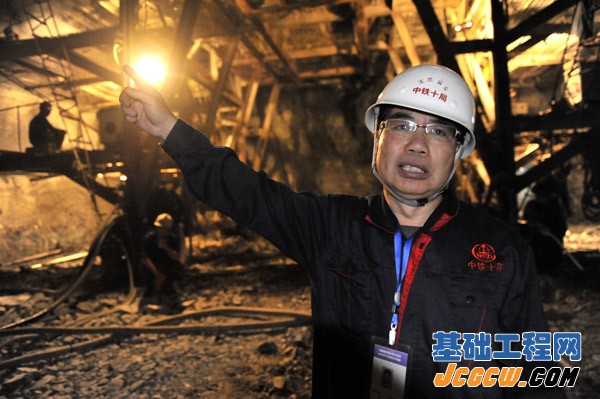 中铁十局宝兰客运专线项目部第三工区党支部书记樊书信正在东岔隧道施工区介绍施工情况