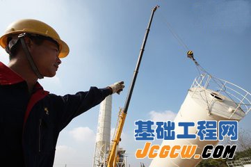 中铁上海局沪通铁路五标段施工人员在指挥大型吊车安装混凝土拌合罐