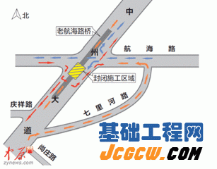 他介绍,同时,因为自来水新老管道碰头和电缆改迁等需要,中州大道航海路口将部分封闭施工,施工区域为航海路中线向南,中州大道正中间的部分(高架匝道下方)。
