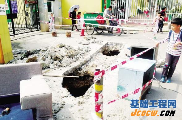 要不是污水井冒出了恶臭难闻的污物,工人挖开旁边的路面清理,谁都没想到,“平整”的路面下竟隐藏着又大又深的两个坑洞。3日上午,事发西林幼儿园侧门,因为地基被掏空,通行有危险,物业人员在四周竖起警示牌,还拉起警戒线。