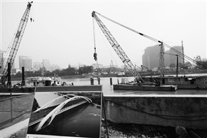 目前,澄浪桥在海曙、江东两头陆地的所有工程桩基施工已经完成,正在进行主桥墩拱脚预埋段、主桥墩基坑施工,以及水中临时钢管桩施工。
