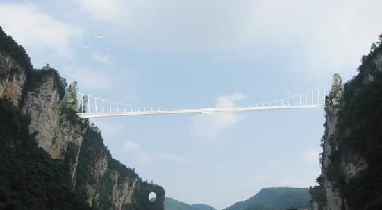 张家界大峡谷玻璃桥项目,拥有世界多项首创,在设计上攻克了脆性玻璃与柔性桥的结合,玻璃桥面防冻、防滑、耐磨,柔性桥抗风、人行震动等多项世界性桥梁建设难题。建成后的玻璃桥将成为世界首座斜拉式高山峡谷玻璃桥和世界最高、最长玻璃桥,也将是世界桥梁建筑史上的奇观和世界性的旅游景观工程。整个玻璃桥工程力争在2015年上半年竣工。