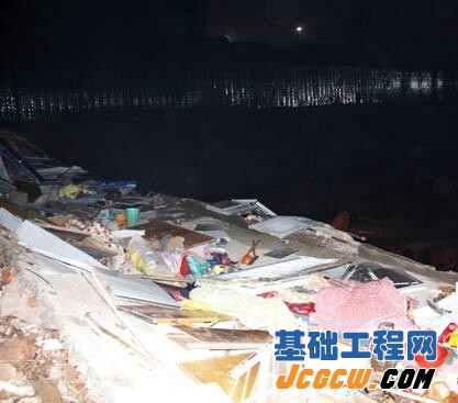 22点55分,记者赶到陇海路与一马路口一个建筑工地内内,看到基坑西侧的护坡突发两处塌陷,在护坡上的几个简易房滑落八米多深的基坑,现场残留着简易房的板材碎片和工友们的生活用品。