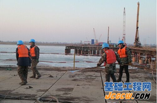 项目部积极采取了各种举措拿下“拦路虎”。施工道路、场地,组织员工及时清扫积雪,用铁锹、铁铲清除冰块;优化混凝土配合比,外部用地暖保温加热、内部通水冷却,并在施工过程中进行温度监控,及时调整保温温度及冷却水的流量,从而确保大体积混凝土的质量;在桩基作业面上,泥浆循环管路均用防寒毡包裹;配备了破冰船,将较大冰块打散成小冰块,从而对栈桥不构成冲撞危险;另在栈桥上设置固定监控岗并投入3台长臂挖机来回巡视,定期巡查冰面开江异动。