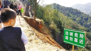 記者在現場看到,羊台山頂出現塌方滑坡的位置,其周圍用樹干、樹枝拉了一條警護帶,旁邊還豎立了一塊印有“邊坡危險請勿靠近”字樣的告示牌。盡管如此,因為羊台山頂部本身空間不大,再加上被幾塊巨型石頭佔據了大部分面積,留下的空地面積較少,所以還是有很多游客,特別是一些小孩,經常在塌方滑坡的位置旁邊來回走動,險象環生,要是一不小心失足墜落懸崖,后果不堪設想。