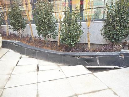 昨日上午10时许,记者来到现场看到,沉降处紧邻钟家村地铁站A出口,沉降地面周围已用施工围挡围起了约10平方米的区域,紧邻花坛的石 板下沉了约5厘米,沉降边缘的石板已翘起,花坛也有明显的下陷。